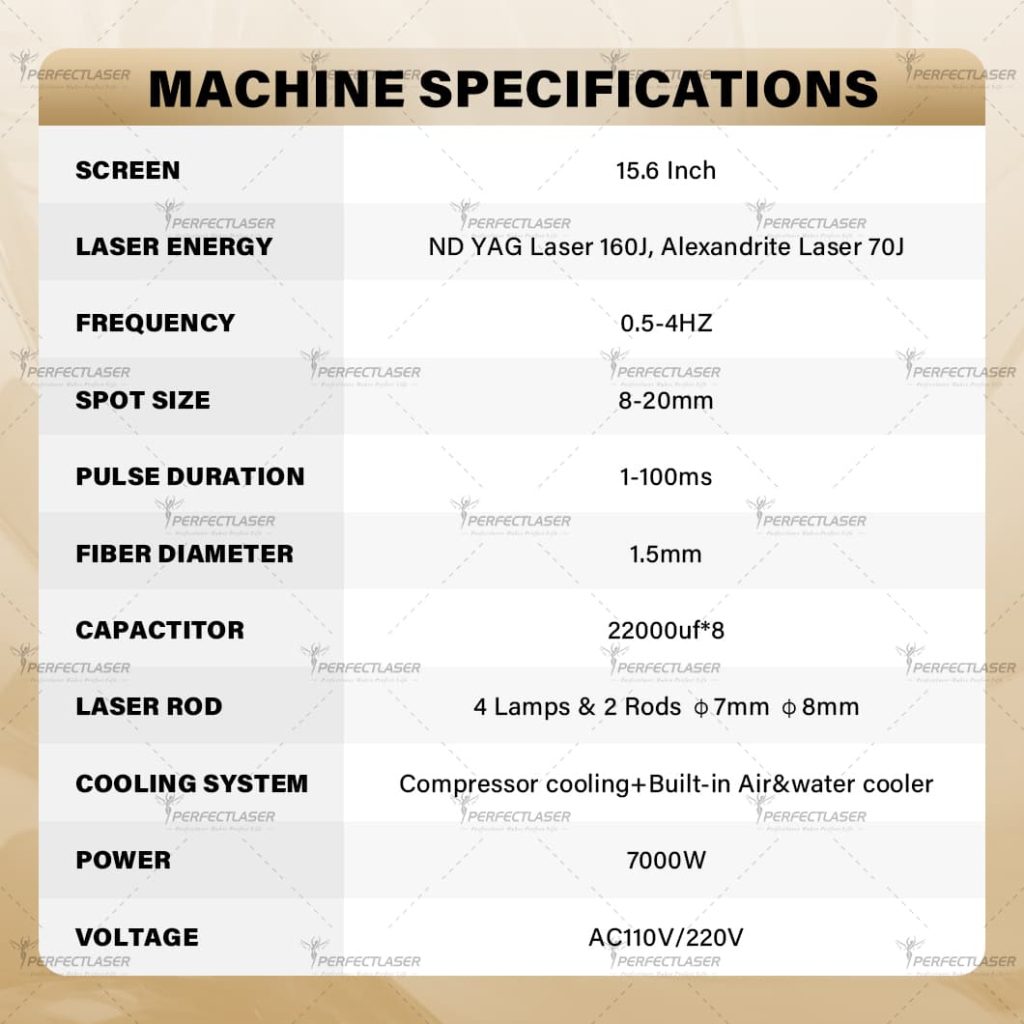 It offers an adjustable pulse duration of 1-100ms, frequency of 0.5-4Hz, and spot size of 8-20mm, allowing customization based on hair thickness and treatment area. With a total power of 7000W, 4 laser lamps, 2 laser rods (φ7mm & φ8mm), and 8 capacitors (22000uf each), it ensures robust and consistent energy output. It supports AC 110V/220V, making it globally compatible.
