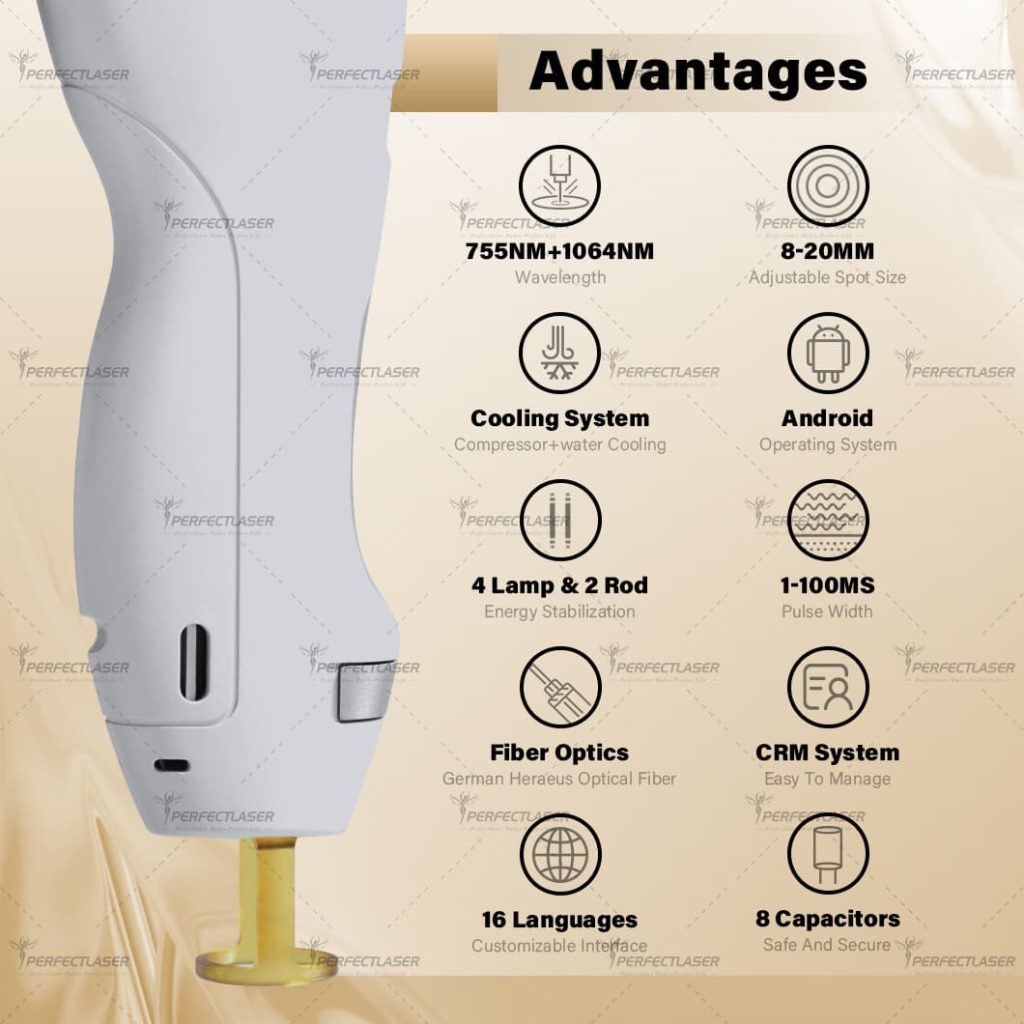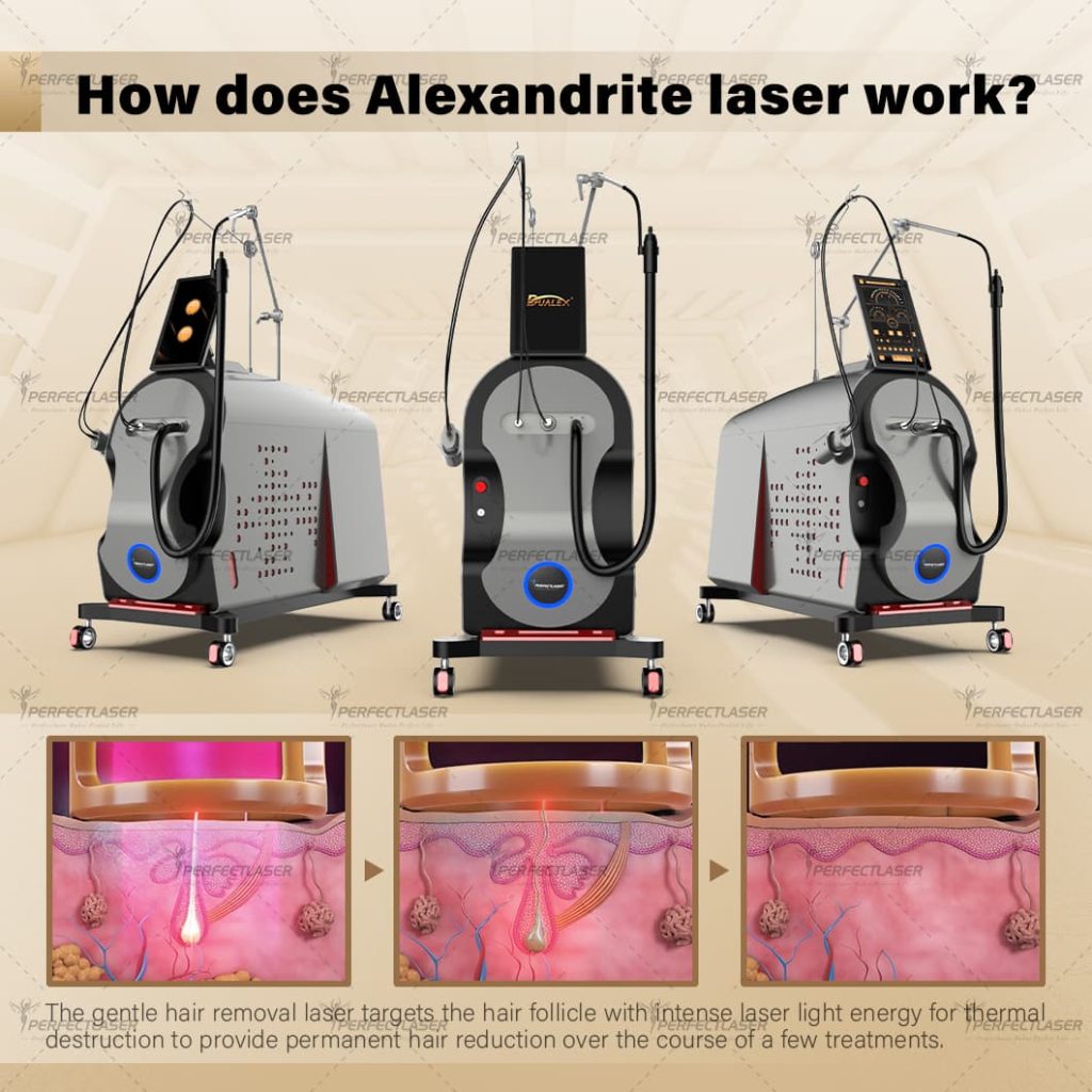 – Hair Removal Mechanism: The Alexandrite laser delivers intense light energy to hair follicles, causing thermal destruction. Over a few sessions, this results in permanent hair reduction. The dual-wavelength design effectively targets hair follicles across a wide range of skin and hair types.