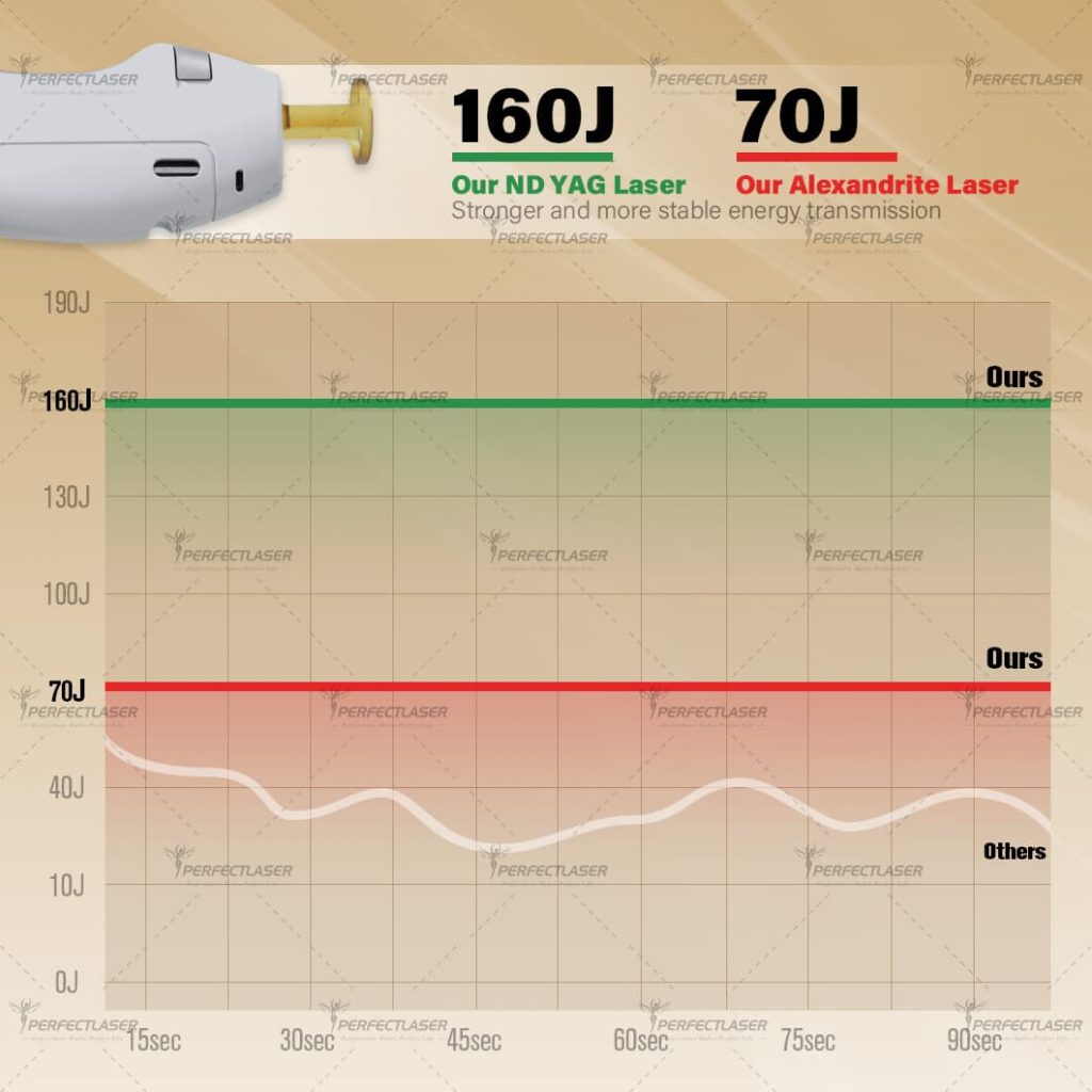 This device features a dual-wavelength laser system with 755nm Alexandrite Laser (70J, red light) and 1064nm ND YAG Laser (160J, green light), specifically engineered to match different skin tones and hair colors. It delivers stable energy transmission (as shown in the energy comparison chart, our lasers maintain consistent output while others fluctuate), enabling precise targeting of hair follicle melanin for efficient hair removal with minimal damage to surrounding tissues.