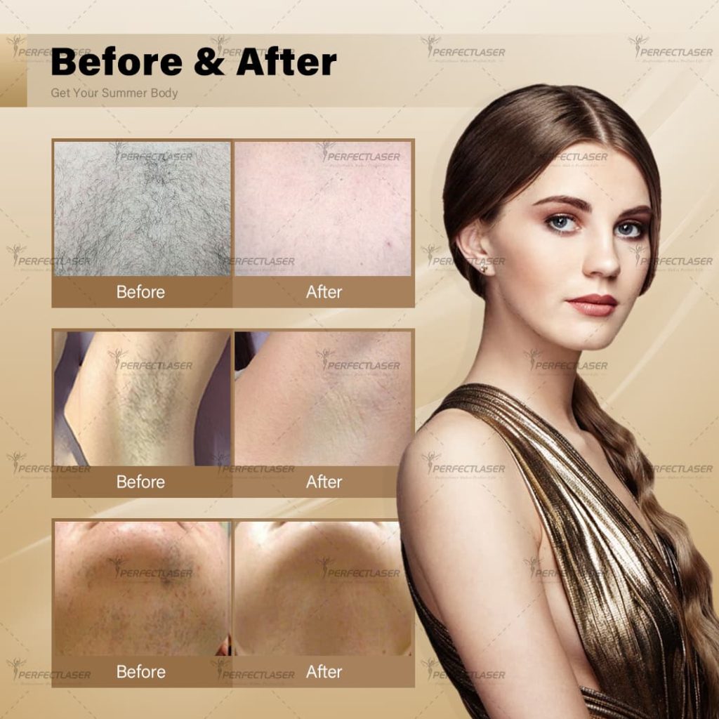 – Before & After Results: Clinical images demonstrate significant hair reduction on areas like limbs, underarms, and bikini lines, with skin appearing smoother and more refined post-treatment.