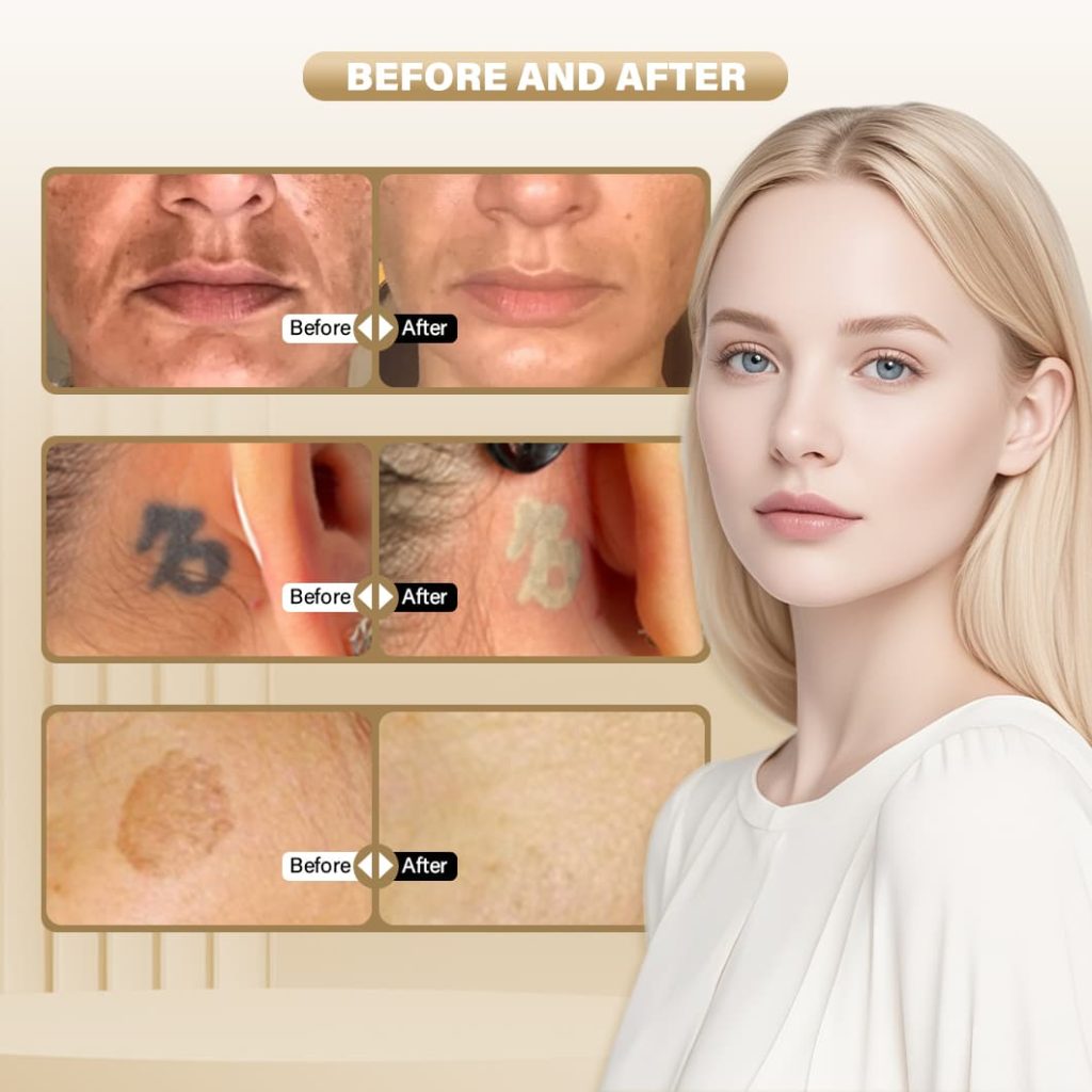 – Clinical Results: Before-and-after images demonstrate significant fading of tattoos, reduction of pigmentation, and improvement in skin texture, validating its remarkable treatment outcomes.