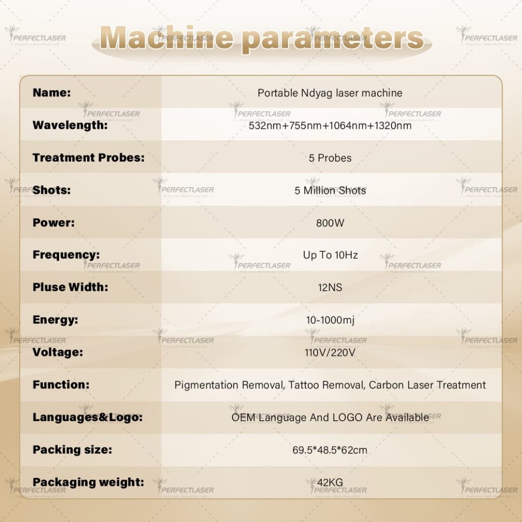 – Wavelength & Energy System: Equipped with multiple wavelengths including 532nm, 755nm, 1064nm, and 1320nm, with an energy range of 10-1000mJ. The pulse width is 12ns, and the operating frequency can reach up to 10Hz, enabling precise targeting of different pigments and tattoo inks.